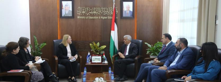 بحث وزير التربية والتعليم العالي د. أمجد برهم مع سفيرة فنلندا لدى دولة فلسطين تاريا كانجاسكورتي؛ آفاق التعاون المشترك، ومستجدات التعليم في ظل الظروف والتحديات الراهنة.