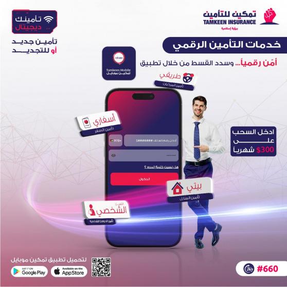 أعلنت شركة تمكين للتأمين عن إطلاق خدمات التأمين الرقمي والتي تتيح للجمهور إصدار او تجديد وثائق التأمين عن بُعد وسداد القسط عبر قنوات الدفع الإلكتروني من خلال تطبيق الهاتف المتنقل تمكين موبايل "Tamkeen Mobile" ونافذة المشتركين الإلكترونية المتوفرة على الموقع الإلكتروني للشركة دون الحاجة إلى زيارة فروع ومكاتب الشركة. أما عن خدمات التأمين الرقمي الجديدة فتشمل: تأمين المركبات، تأمين السفر، التأمين المنزلي الشامل وتأمين الحوادث الشخصية.