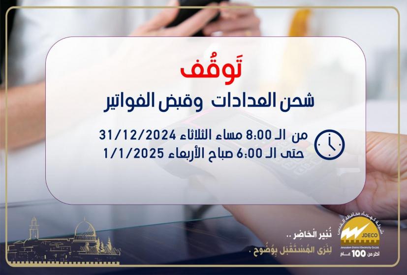 أعلنت شركة كهرباء محافظة القدس عن توقف عمليات شحن العدادات وقبض الفواتير في جميع فروع الشركة ومكاتبها ومراكز الشحن الخارجية والتطبيق الإلكتروني، وذلك يوم الثلاثاء 31/12/2024 من الساعة الثامنة مساءً وحتى الأربعاء 1/1/2025 الساعة السادسة صباحاً، بسبب أعمال الجرد السنوي وإغلاق السنة المالية.