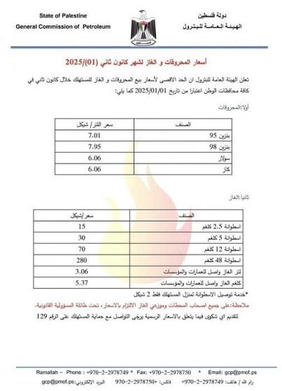 أسعار المحروقات والغاز في فلسطين لشهر يناير 2025