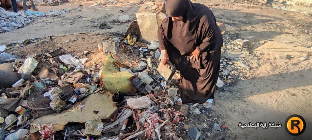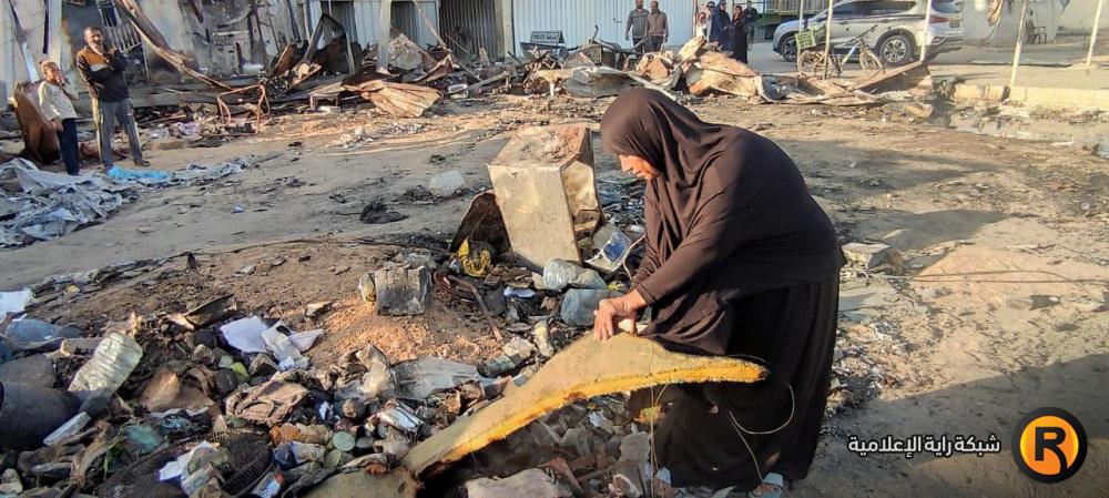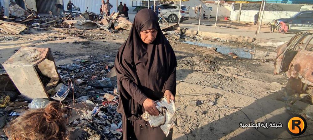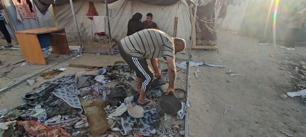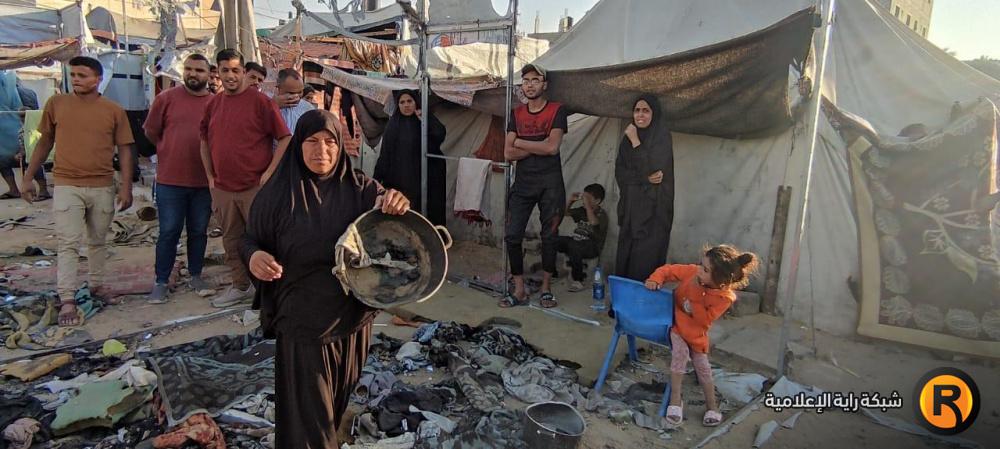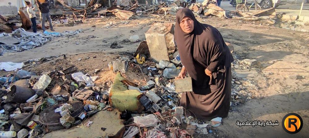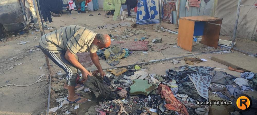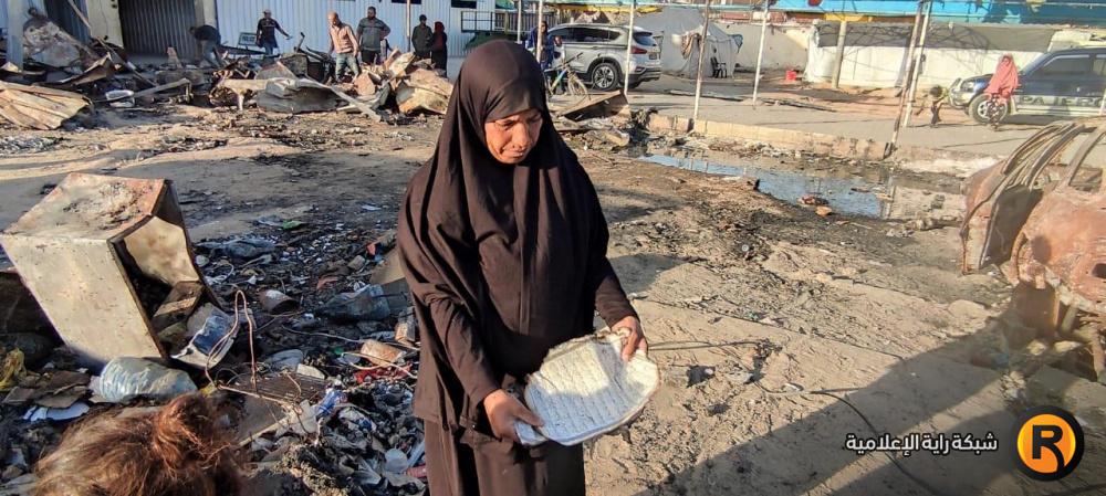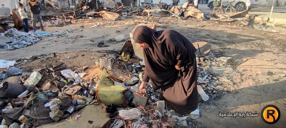 "رايــة" قابلت العم أبو محمد وزوجته، على أنقاض الخيمة المحروقة، حيث تجمع عدد من الجيران النازحين حولهما وهما يلتقطان بقايا العفش المُحترق، علها تشكل حجر الأساس لإعادة الحياة للمكان.