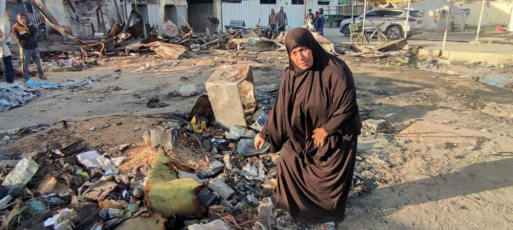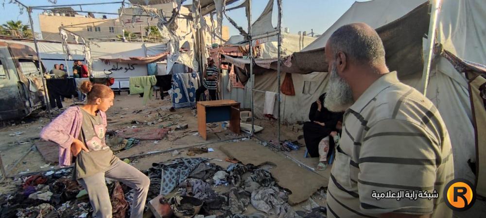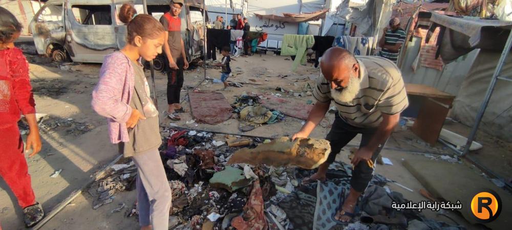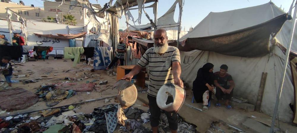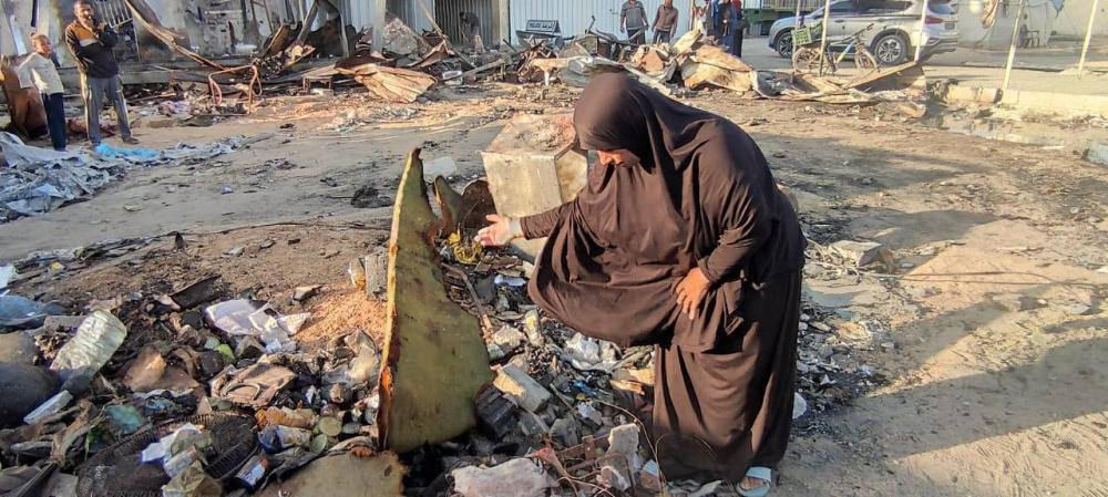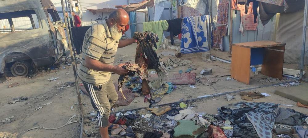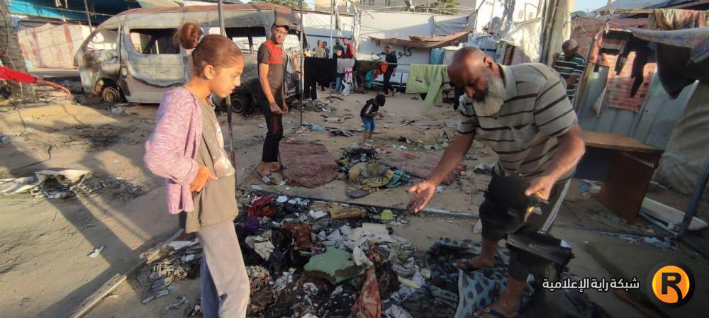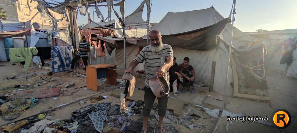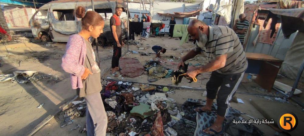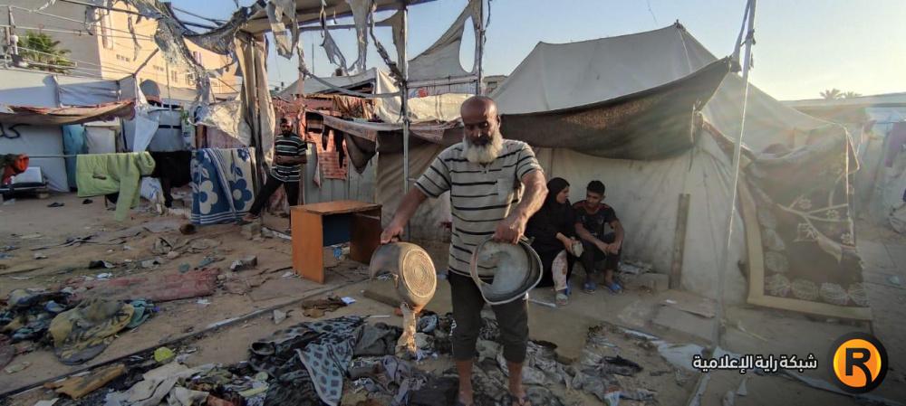 "رايــة" قابلت العم أبو محمد وزوجته، على أنقاض الخيمة المحروقة، حيث تجمع عدد من الجيران النازحين حولهما وهما يلتقطان بقايا العفش المُحترق، علها تشكل حجر الأساس لإعادة الحياة للمكان.
