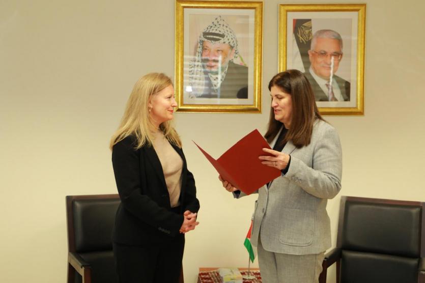 تسلمت وزيرة الدولة لشؤون الخارجية والمغتربين فارسين أغابيكيان شاهين، اليوم الأحد، نسخة من رسالة التعيين الخاصة بالقنصل البريطاني العام الجديد هيلين ونترتون، في مقر الوزارة بمدينة رام الله، بحضور مساعد وزير الخارجية السفير عمر عوض الله، ورئيسة المراسم السفيرة عبير الرمحي.