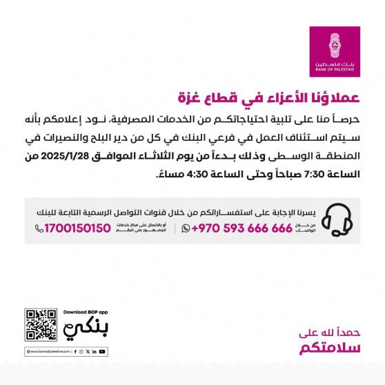 أعلن بنك فلسطين اليوم الاثنين؛ إعادة فتح فرعين للبنك في المحافظة الوسطى بقطاع غزة.