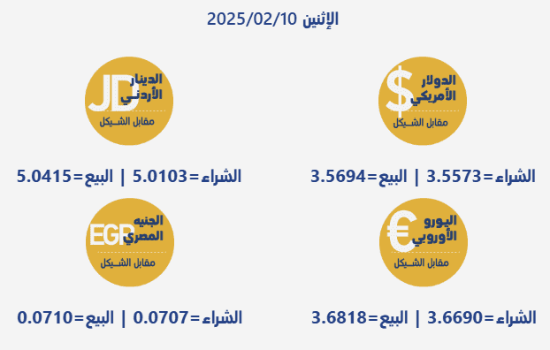 جاءت أسعار صرف العملات مقابل الشيقل الإسرائيلي، اليوم الإثنين، بحسب سلطة النقد الفلسطينية، على النحو التالي: