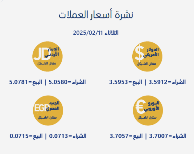 جاءت أسعار صرف العملات مقابل الشيقل الإسرائيلي، اليوم الثلاثاء، بحسب سلطة النقد الفلسطينية، على النحو التالي: