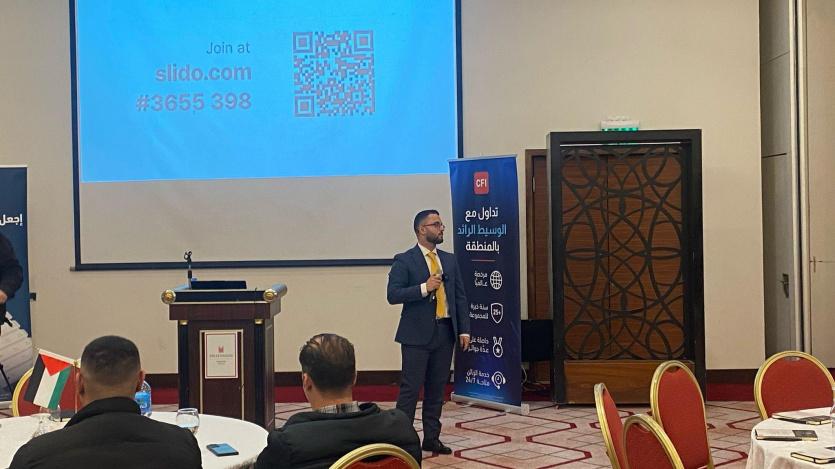 وفي بداية اللقاء استعرض محلل الأسواق في شركة سي أف أي بفلسطين مجدي النوري محتويات محاضرته والتي تمثلت بتعريف لمفهوم الأسواق المالية، وأنواع أدوات الاستثمار والتداول، وقراءة الأسواق وكيفية تحليلها، واستراتيجية التداول وإدارة المخاطر ومنصة التداول MT5.