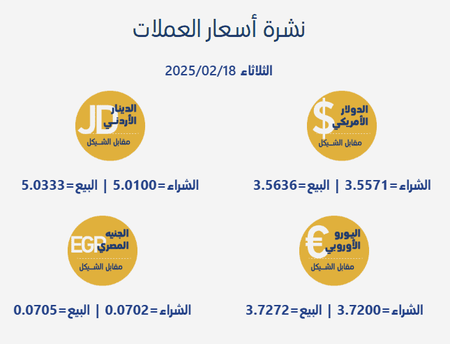 جاءت أسعار صرف العملات مقابل الشيقل الإسرائيلي، اليوم الثلاثاء، بحسب سلطة النقد الفلسطينية، على النحو التالي: