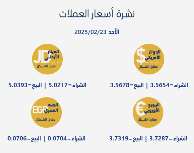 جاءت أسعار صرف العملات مقابل الشيقل الإسرائيلي، اليوم الأحد، بحسب سلطة النقد الفلسطينية، على النحو التالي: