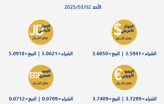 جاءت أسعار صرف العملات مقابل الشيقل الإسرائيلي، اليوم الأحد، بحسب سلطة النقد الفلسطينية، على النحو التالي: