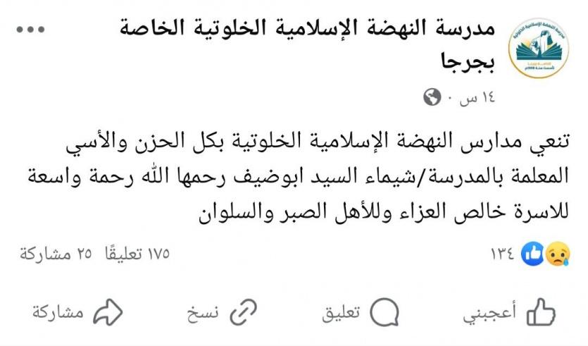 وعبر فيسبوك، نعت مدارس النهضة الإسلامية الخلوتية بكل الحزن والأسي المعلمة بالمدرسة/شيماء السيد ابوضيف رحمها الله رحمة واسعة للاسرة خالص العزاء وللأهل الصبر والسلوان.