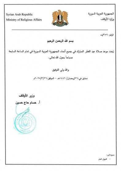حددت وزارة الأوقاف السورية أن صلاة عيد الفطر لعام 2025 ستنطلق في تمام الساعة السابعة صباحًا، وذلك في جميع المدن والمحافظات السورية. يعتبر هذا التوقيت هو الموعد الرسمي الذي سيتم فيه إقامة الصلاة في المصليات العامة وكذلك في المساجد الكبرى التي تحتفل بالمناسبة.
