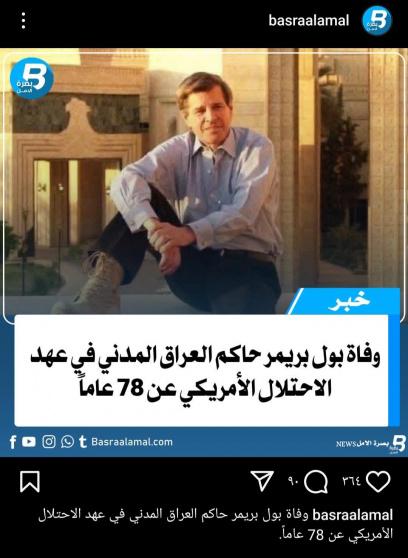 في عصر تنتشر فيه الأخبار بسرعة فائقة عبر وسائل التواصل الاجتماعي، أصبح التحقق من صحة المعلومات أمرًا بالغ الأهمية. انتشرت مؤخرًا عبر حساب "بصرة الأمل" على منصة إنستغرام شائعة تفيد بوفاة بول بريمر، الحاكم المدني الأمريكي السابق للعراق بعد الغزو عام 2003، عن عمر ناهز 78 عامًا. وقد أثارت هذه الشائعة تفاعلًا واسعًا وجدلاً بين المتابعين، ما استدعى التحقق والتقصي عن صحة الخبر.