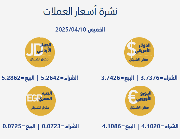 جاءت أسعار صرف العملات مقابل الشيقل الإسرائيلي، اليوم الخميس، بحسب سلطة النقد الفلسطينية، على النحو التالي:
