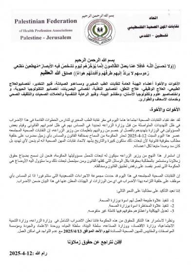 وحذرت النقابات في بيان لها، الحكومة من المساس بمنتسبيها العاملين في وزراة الزراعة، بعد تهديدهم بالفصل أو الخصم من رواتبهم من قبل بعض المسؤولين في الوزارة وبتعليمات من وزير الزارعة، وذلك على خلفية مشاركتهم بإضرابات نقابات المهن الصحية.