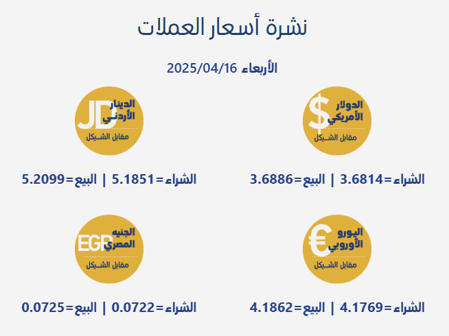 جاءت أسعار صرف العملات مقابل الشيقل الإسرائيلي، اليوم الثلاثاء، بحسب سلطة النقد الفلسطينية، على النحو التالي: