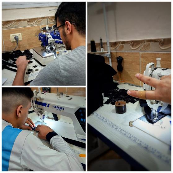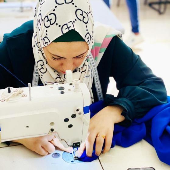 ولاء أبو ضباع تعمل على ماكينة الخياطة