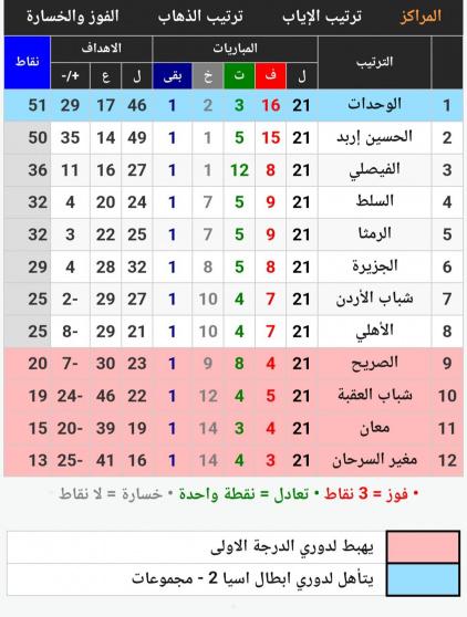 بهذه النتيجة هبطت أندية مغير السرحان وشباب العقبة ومعان والصريح رسميا إلى مصاف أندية الدرجة الأولى، وبات الصراع فقط على هوية بطل الدوري الذي انحصر بين الوحدات 51 نقطة، والحسين إربد 50 نقطة.