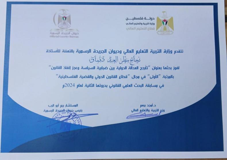 مؤخراً، تُوّجت د. نجاح مسيرتها بفوزها بالمرتبة الأولى في مسابقة البحث العلمي القانوني – الدورة الثانية لعام 2024 عن بحثها المتميز: "تأرجح العدالة الدولية بين ضبابية السياسة وعجز إنفاذ القانون"، الذي يعالج بجرأة وعمق الواقع القائم في مؤسسات العدالة الدولية حين يتعلق الأمر بفلسطين.