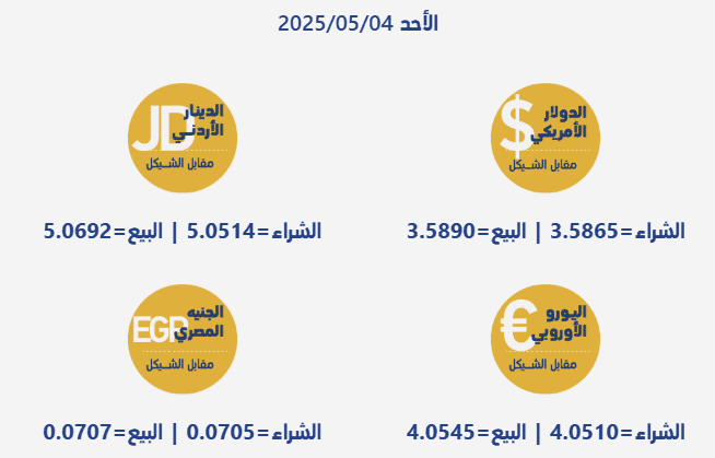 جاءت أسعار صرف العملات مقابل الشيقل الإسرائيلي، اليوم الأحد، بحسب سلطة النقد الفلسطينية، على النحو التالي: