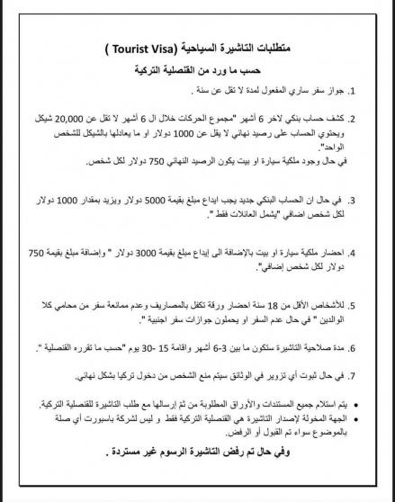 نشرت وسائل إعلام فلسطينية أن القنصلية التركية أدخلت تعديلات جديدة ومشددة على متطلبات الحصول على التأشيرة السياحية (Tourist Visa) لحاملي الجواز الفلسطيني، وأوضحت أن تطبيق الشروط الجديدة بدأ وفقاً لما ورد رسمياً من القنصلية.