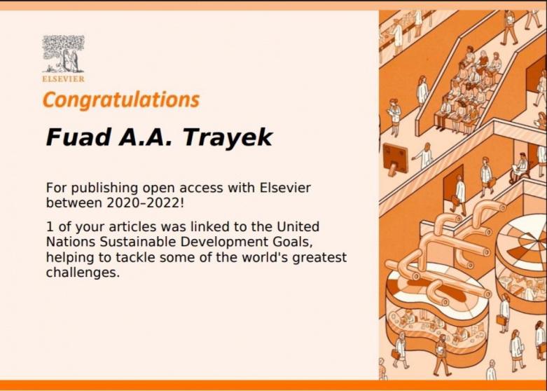 في إنجاز أكاديمي نوعي يُضاف إلى رصيد الباحثين الفلسطينيين على الساحة الدولية، حصل الباحث الفلسطيني الدكتور فؤاد علي العجوري، المقيم في المملكة المتحدة، على شهادة تقدير دولية من دار النشر العالمية الرائدة Elsevier، تقديراً لمساهمته الفاعلة في مجال النشر العلمي المفتوح، وارتباط أحد بحوثه المنشورة خلال الفترة من 2020 إلى 2022 بأهداف التنمية المستدامة للأمم المتحدة (UN SDGs).