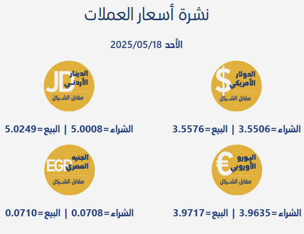 جاءت أسعار صرف العملات مقابل الشيقل الإسرائيلي، اليوم الأحد، بحسب سلطة النقد الفلسطينية، على النحو التالي: