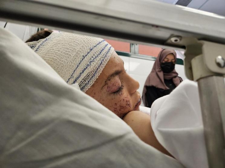 وقال مجمع ناصر الطبي في منشور إن الطبيبة النجار المفجوعة باستشهاد أطفالها التسعة، تقف أمام قسم العمليات تنتظر مصير الناجي الوحيد من بين أشقائه وزوجها أيضا.