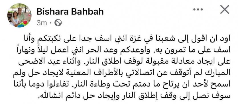 جدير بالذكر، أن الوسيط الفلسطيني الاميركي بشارة بحبح قال عبر صفحته على فيسبوك: "اود ان اقول إلى شعبنا في غزة انني اسف جدا على نكبتكم وأنا اسف على ما تمرون به. واوعدكم وعد الحر انني اعمل ليلاً ونهاراً على ايجاد معادلة مقبولة لوقف اطلاق النار. واثناء عيد الاضحى المبارك لم أتوقف عن اتصالاتي بالأطراف المعنية لايجاد حل ولم اسمح لأحد ان يرتاح ما دمتم تحت وطاءة النار. تفاءلوا دوما بأننا سوف نصل إلى وقف إطلاق النار وإيجاد حل دائم انشالله".