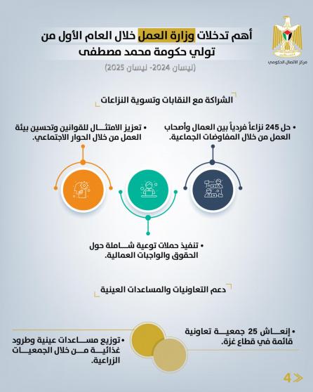 استعرض مركز الاتصال الحكومي حصيلة أهم تدخلات وزارة العمل الفلسطينية خلال العام الأول من تولي الحكومة، مركزًا على تدخلاتها في دعم العمال المتعطلين، وتحفيز الريادة، وتعزيز التشغيل، وتنظيم سوق العمل، وتوسيع الشراكات محلياً ودولياً.
