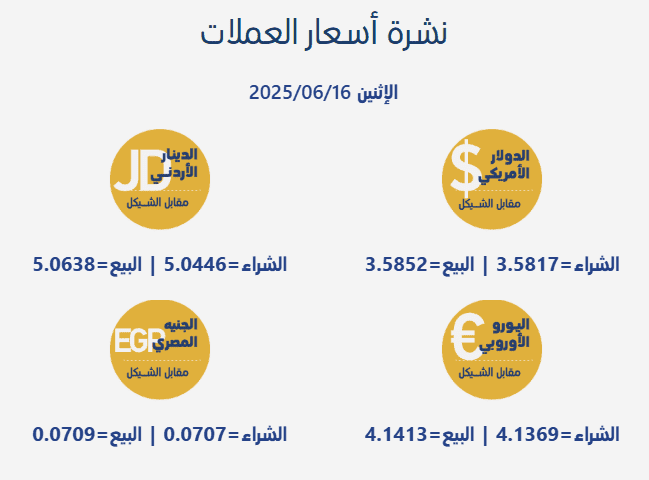 جاءت أسعار صرف العملات مقابل الشيقل الإسرائيلي، اليوم الإثنين، بحسب سلطة النقد الفلسطينية، على النحو التالي: