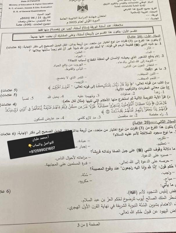 تقدّم طلاب الثانوية العامة في فلسطين صباح اليوم السبت 21 يونيو 2025، لأداء أول امتحاناتهم ضمن الدورة الأولى، حيث استهلوا اليوم الأول باختبار التربية الإسلامية، الذي احتوى على أسئلة موضوعية ومقالية متنوعة تغطي مفاهيم الشريعة، العقيدة، الحديث، الفقه، القيم الإسلامية، والأحكام الفقهية. الامتحان تضمن قسميْن رئيسيين (أ و ب) وعلى الطالب أن يجيب عن أحدهما فقط، وهو ما يعكس نمطًا مرنًا في التقييم.