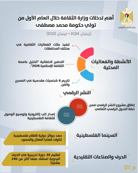 أصدر مركز الاتصال الحكومي تقريراً يُلخّص أهم تدخلات وزارة الثقافة الفلسطينية خلال العام الأول من تولي حكومة محمد مصطفى (نيسان 2024 - نيسان 2025)، إذ تميز بتحقيق خطوات هامة في حماية التراث، ودعم المشهد الثقافي والإبداعي، وتعزيز الحضور الفلسطيني في الساحة الدولية.
