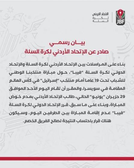 قرر الاتحاد الأردني لكرة السلة، الانسحاب رسميا من مباراته أمام منتخب إسرائيل في بطولة كأس العالم للعبة تحت 19 عاما.