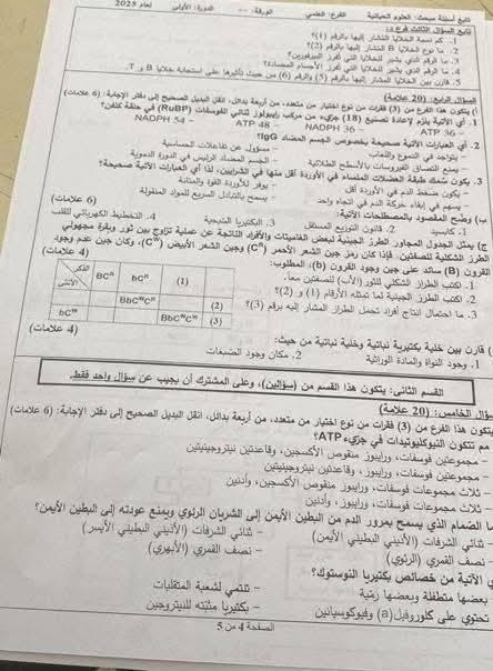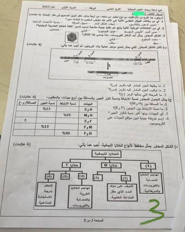 نوفر لكم فيما يلي النسخة الكاملة من ورقة أسئلة امتحان العلوم الحياتية (الأحياء) للفرع العلمي مع الإجابات النموذجية، كما أعدها نخبة من المعلمين المتخصصين، لتتمكنوا من مقارنة إجاباتكم وتقدير مستواكم التقريبي: