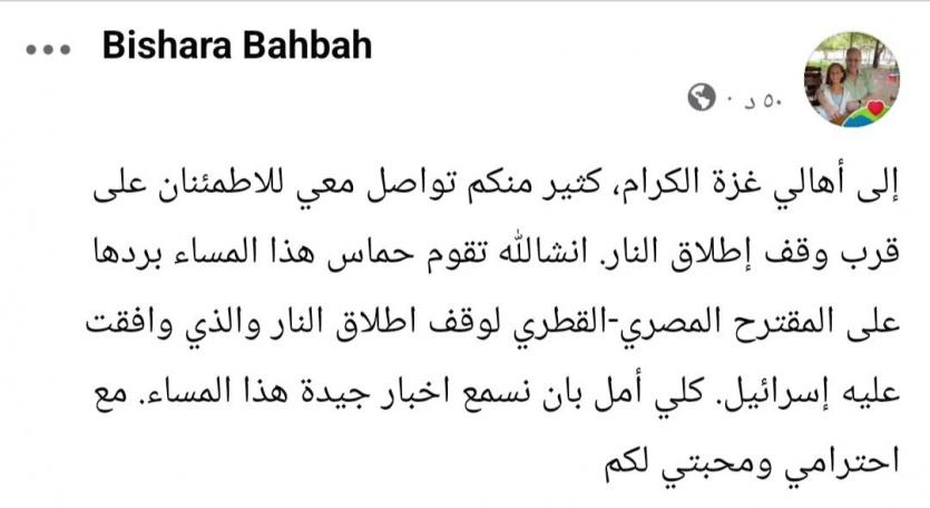وأوضح بحبح، في منشور عبر حسابه على فيسبوك، أنه تلقى العديد من الاتصالات من أهالي غزة للاستفسار عن آخر مستجدات التهدئة، معبّرًا عن أمله في "سماع أخبار جيدة هذا المساء".