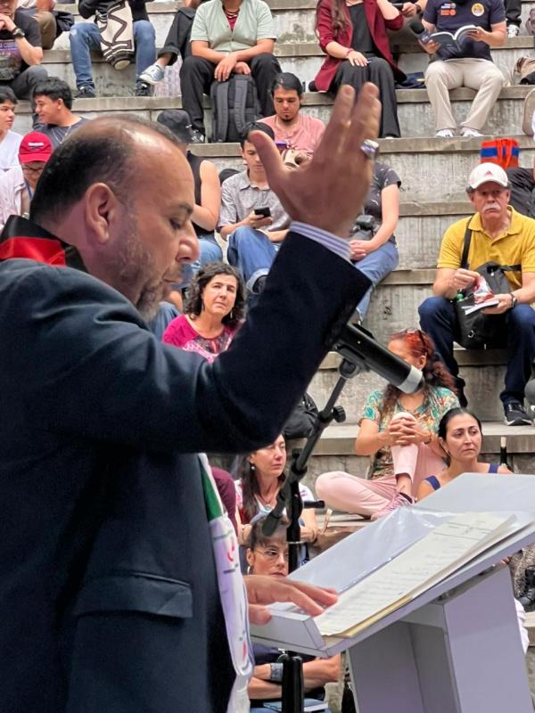 وفي كلمته التي ألقاها بالعربية ومترجمة للإسبانية قال الشاعر السوداني : "شكرًا عاليًا للصديق الشاعر الكبير:فرناندو ريندون، رئيس المهرجان ورئيس حركة الشعر العالميةوللقائمين على هذا المهرجان ، على هذه التظاهرة الشعرية العالمية، وشكرًا ثانيًا على الحدث الكبير الذي نظمه بالتعاون مع منسقي حركة الشعر العالمية بمشاركة 170 شاعرة وشاعرًا من 110 دول في العالم، انتصارًا لغزة ورفضًا للإبادة الجماعية والثقافية.