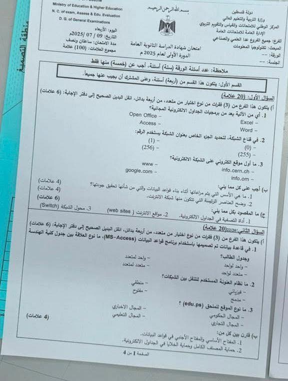 إجابة حل امتحان التكنولوجيا 2025 توجيهي فلسطين الفرع الأدبي