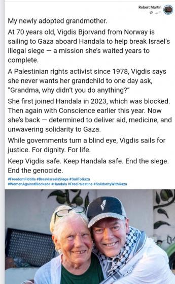 فيغديس، التي تنشط في دعم حقوق الفلسطينيين منذ عام 1978، أعربت عن رغبتها في أن تكون جزءًا من هذا الجهد الدولي، مؤكدةً أنها لا تريد أن يسألها حفيدها يومًا: "جدتي، لماذا لم تفعلي شيئًا؟"