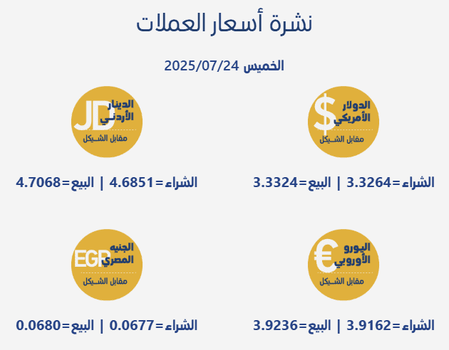 جاءت أسعار صرف العملات مقابل الشيقل الإسرائيلي، اليوم الخميس، بحسب سلطة النقد الفلسطينية، على النحو التالي: