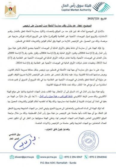 أصدرت هيئة سوق رأس المال إخطارًا دعت فيه األفراد والجهات التي تمارس أنشطة تتعلق بالتعامل أو الترويج في البورصات - دون الحصول على التراخيص اللازمة من الهيئة، إلى التوقف الفوري عن هذه الممارسات، وذلك (Forex (الأجنبية غير النظامية .استنادًا إلى القوانين واألنظمة المعمول بها في فلسطين.