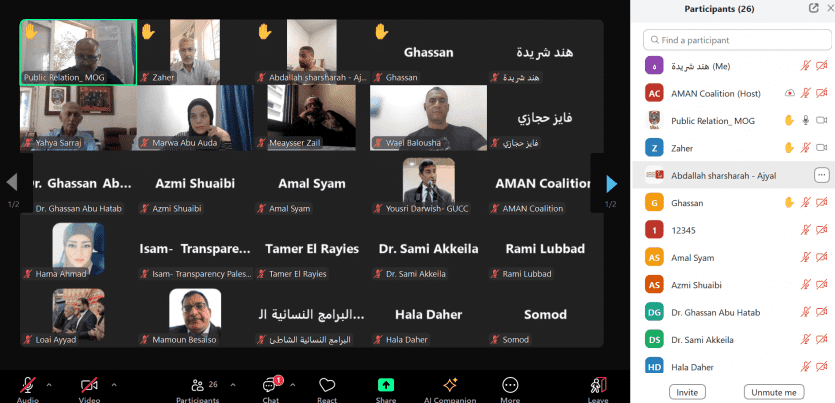 عقد الائتلاف من أجل النزاهة والمساءلة (أمان) عبر منصة الزووم، جلسة نقاش تقرير بعنوان: "استجابة بلدية غزة لمتطلبات المساءلة والمشاركة المجتمعية خلال الإبادة الجماعية على قطاع غزة"، والذي يهدف إلى تسليط الضوء على قدرة بلدية غزة على مواصلة تقديم خدماتها العامة الحيوية في ظل الحرب، وتقييم مدى التزامها بمبادئ الشفافية والمساءلة، ومشاركتها المجتمعية في ظل الظروف الإنسانية القاسية التي يعيشها سكان المدينة.