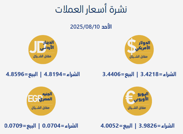 جاءت أسعار صرف العملات مقابل الشيقل الإسرائيلي، اليوم الأحد، بحسب سلطة النقد الفلسطينية، على النحو التالي: