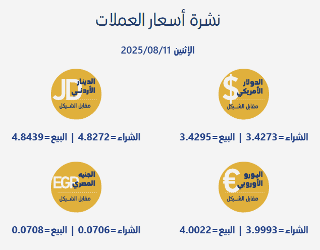 جاءت أسعار صرف العملات مقابل الشيقل الإسرائيلي، اليوم الإثنين، بحسب سلطة النقد الفلسطينية، على النحو التالي: