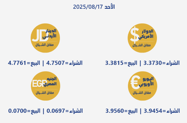 جاءت أسعار صرف العملات مقابل الشيقل الإسرائيلي، اليوم الأحد، بحسب سلطة النقد الفلسطينية، على النحو التالي: