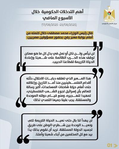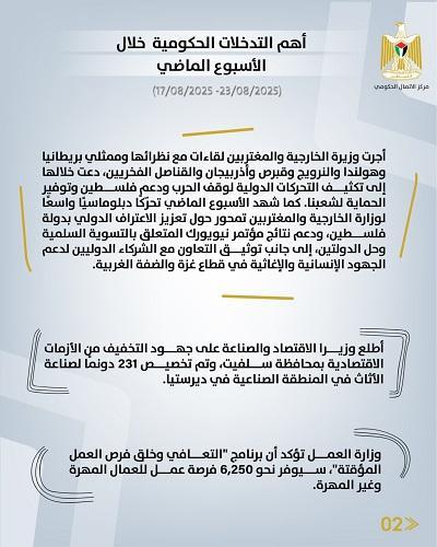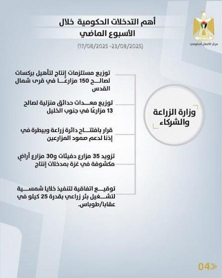 أصدر مركز الاتصال الحكومي تقريرا يبرز أهم التدخلات التنموية والإصلاحية التي نفذَّتها الحكومة الفلسطينية، خلال الأسبوع الماضي (17/08/2025 – 23/08/2025)، وهي على النحو الآتي: