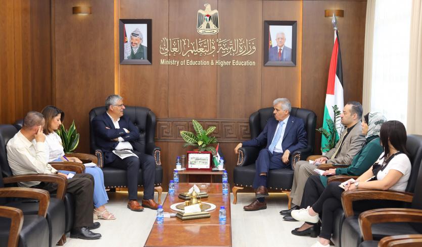 بحث وزير التربية والتعليم العالي د. أمجد برهم، في مكتبه، اليوم، مع مدير عام مؤسسة التعاون في فلسطين د. طارق إمطيرة سبل تعزيز الدعم لقطاع التعليم الفلسطيني بشقيه العام والعالي.