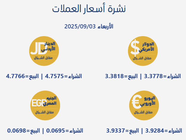 جاءت أسعار صرف العملات مقابل الشيقل الإسرائيلي، اليوم الأربعاء، بحسب سلطة النقد الفلسطينية، على النحو التالي: