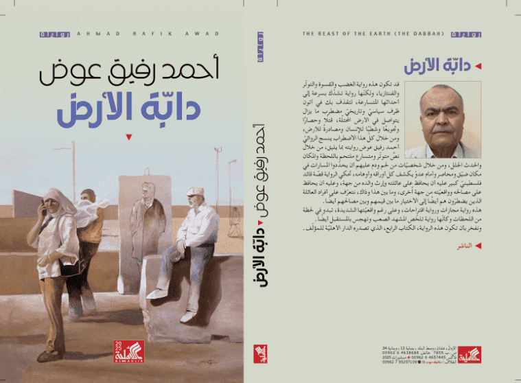صدرت رواية "دابة الأرض" للروائي أحمد رفيق عوض حديثاً، عن دار الأهلية للتوزيع والنشر في العاصمة الأردنية، عمان، وقد جاءت في 296 صفحة من القطع المتوسط، وصمم غلافها المبدع زهير أبو شايب، وتعد هذه الرواية العاشرة في رصيد الروائي عوض، وهي تحكي قصة مسئول فلسطيني كبير يتعرض لتجارب قاسية على المستوى الشخصي والعام، حيث كل شيء على حد السكين وحافة الهاوية، وقد كتب الناشر كلمة على الغلاف الأخير للرواية، جاء فيه..