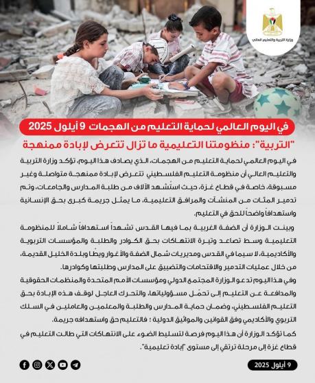 في اليوم العالمي لحماية التعليم من الهجمات، الذي يصادف هذا اليوم، تؤكد وزارة التربية والتعليم العالي أن منظومة التعليم الفلسطيني تتعرض لإبادة ممنهجة متواصلة وغير مسبوقة، خاصة في قطاع غزة، حيث استُشهد الآلاف من طلبة المدارس والجامعات، وتم تدمير المئات من المنشآت والمرافق التعليمية، ما يمثل جريمة كبرى بحق الإنسانية واستهدافاً واضحاً للحق في التعليم.